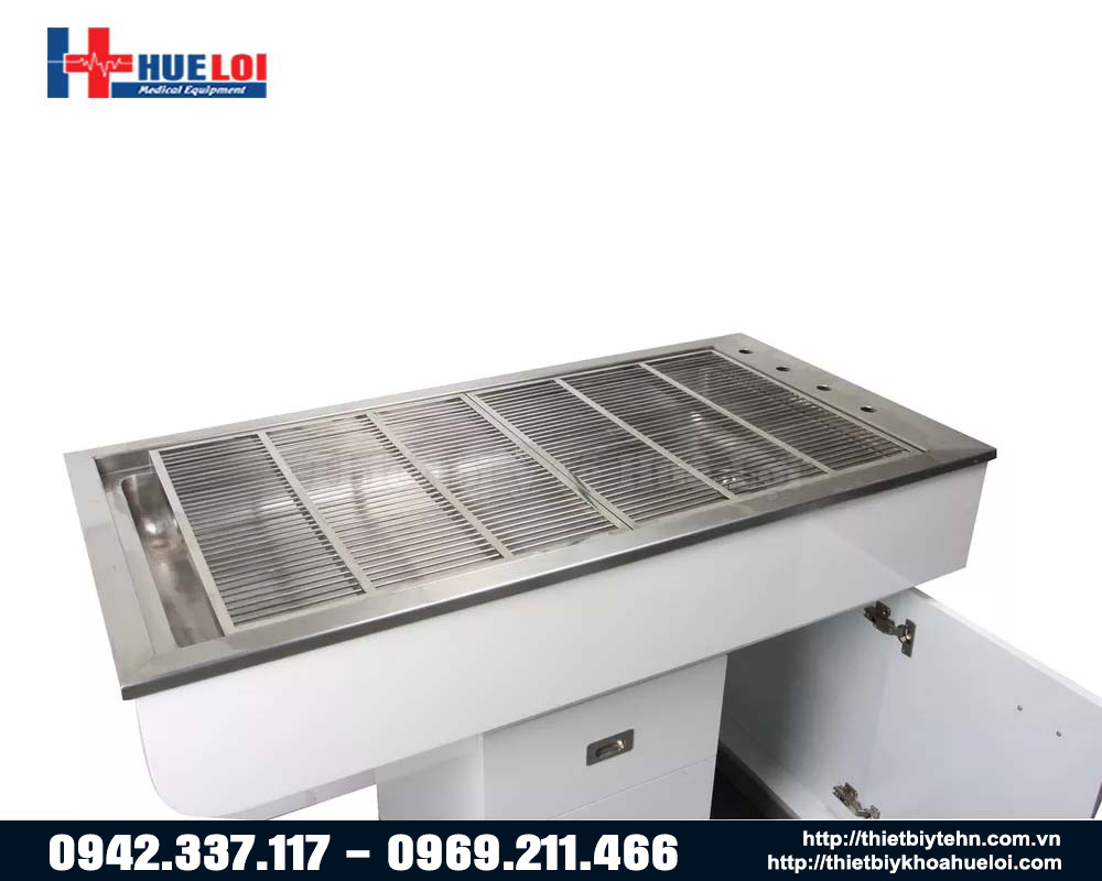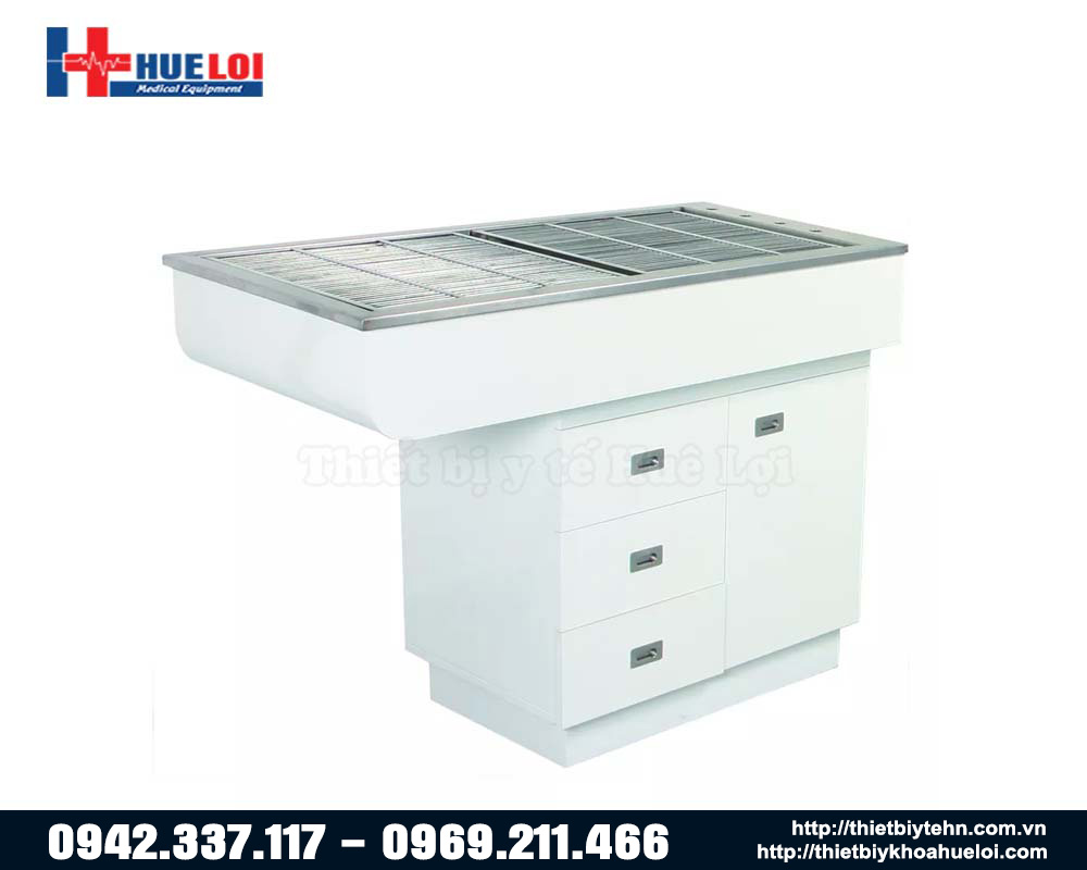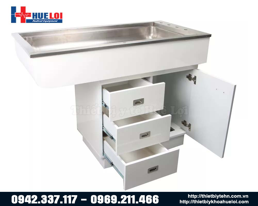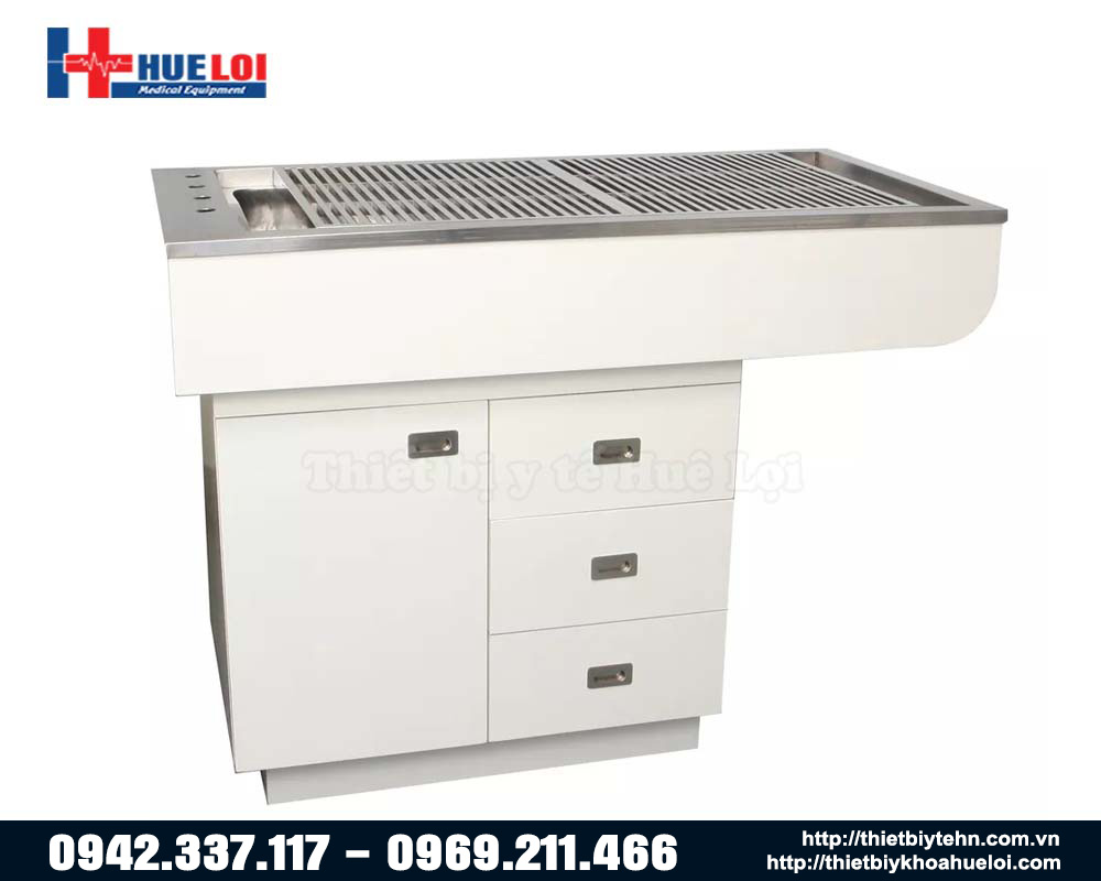 - Bên dưới bàn là tủ đề đồ cho không gian lưu trữ dụng cụ khám