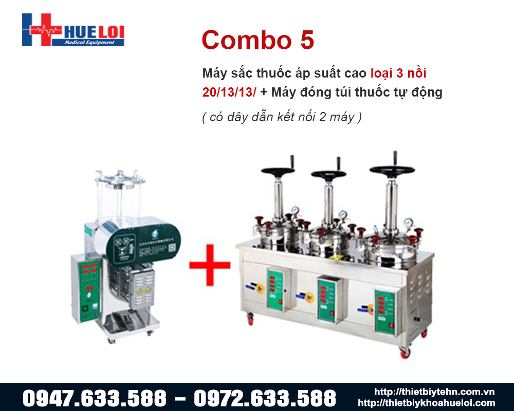 - Combo 1: Máy sắc thuốc áp suất cao 20L + Máy đóng túi tự động = 45.000.000 VND
