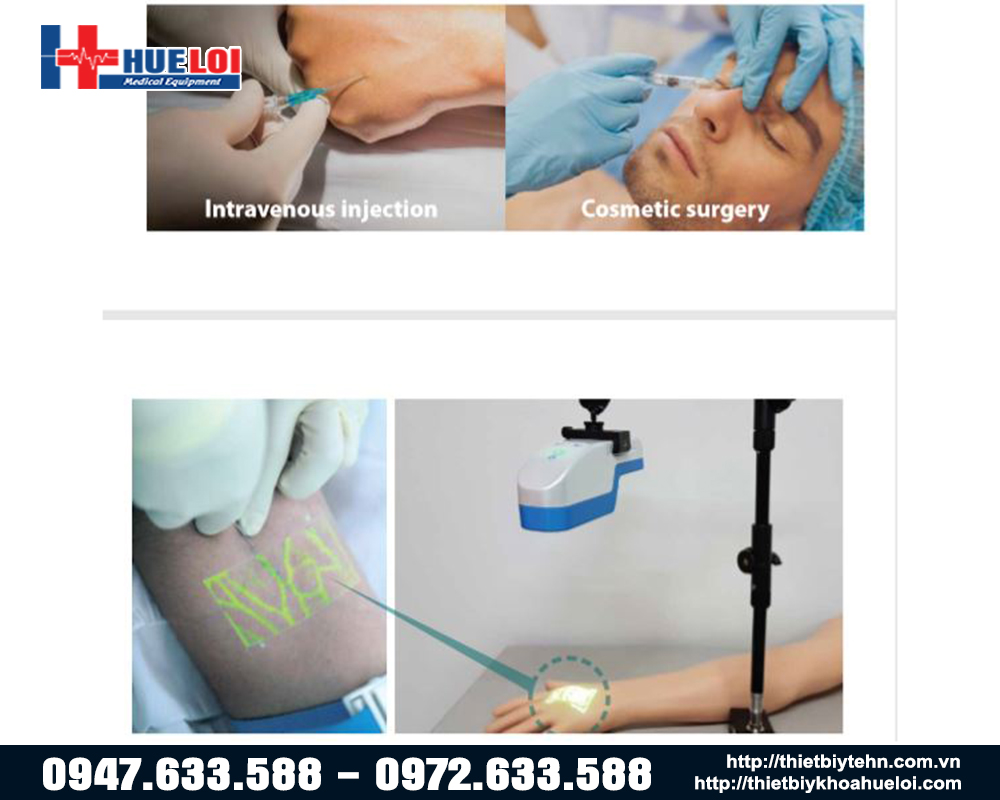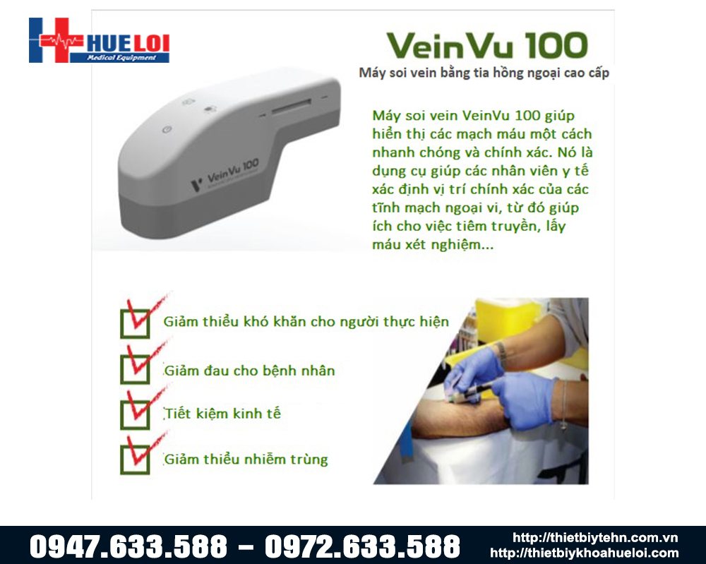 Đèn hồng ngoại soi tĩnh mạch Veinvu 100 xuất xứ Hàn Quốc, sử dụng công nghệ tia hồng ngoại cao cấp giúp hiển thị hệ thống tĩnh mạch ngoại vi một cách nhanh chóng và chính xác, giúp nhân viên y tế xác định vị trí và đường đi của mạch máu, từ đó giúp ích trong một số thủ thuật tiêm truyền, lấy máu... Vừa tăng cường độ chính xác lại giảm thiểu đau đớn cho bệnh nhân và tiết kiệm thời gian cho nhân viên y tế.