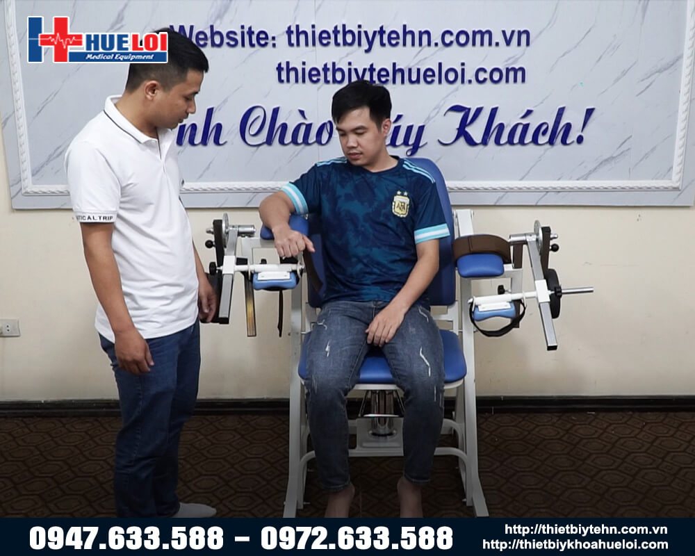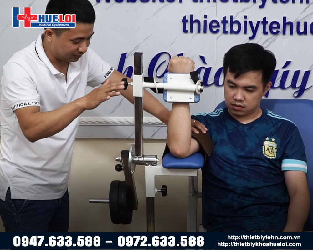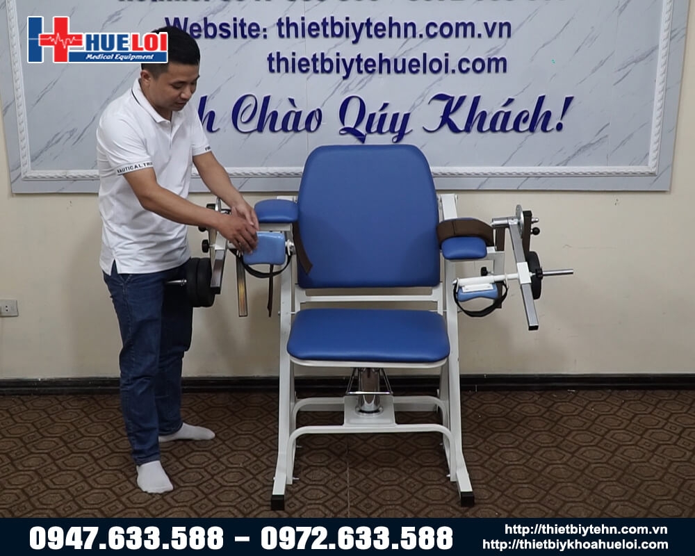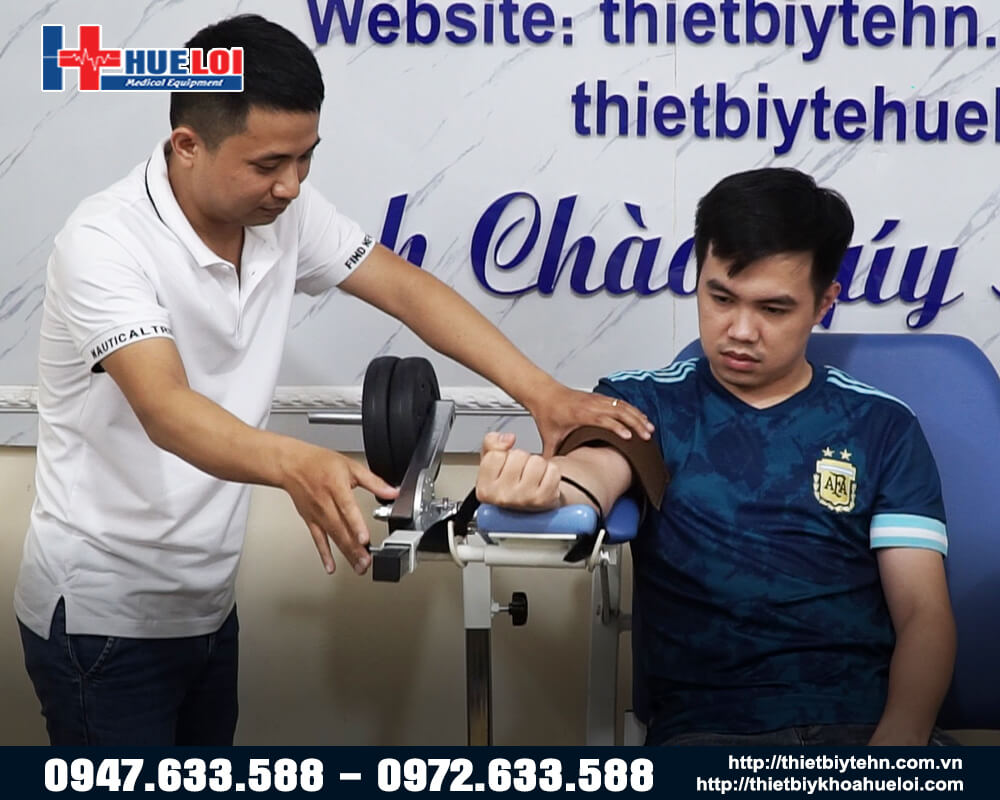 - Cách sử dụng thiết bị để tập luyện vô cùng đơn giản. Đầu tiên cho bệnh nhân ngồi vào ghế rồi tùy chỉnh các thông số như: chiều cao ghế ngồi, góc tựa lưng, chiều dài cẳng tay, góc tập, trở lực tập luyện (thông qua hệ thống bánh tạ). Sau đó cố định phần cánh tay và bàn tay thông qua các đai đai giữ.