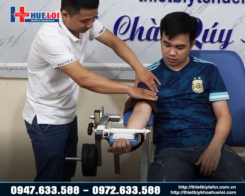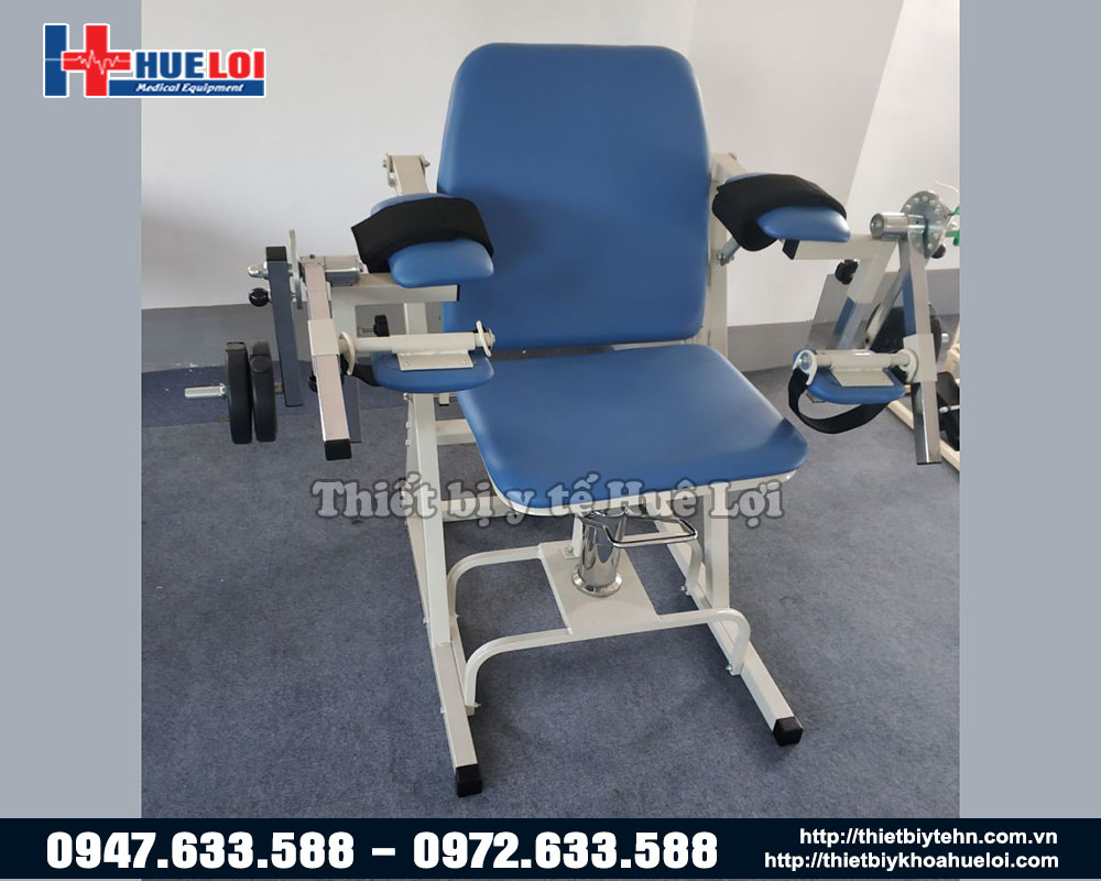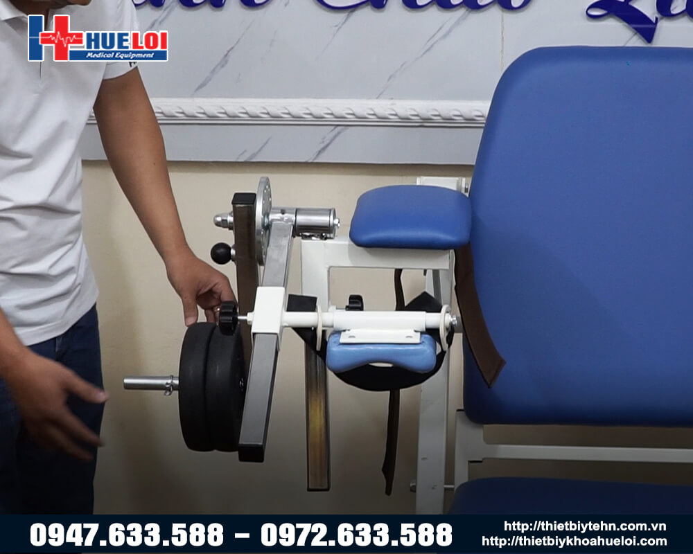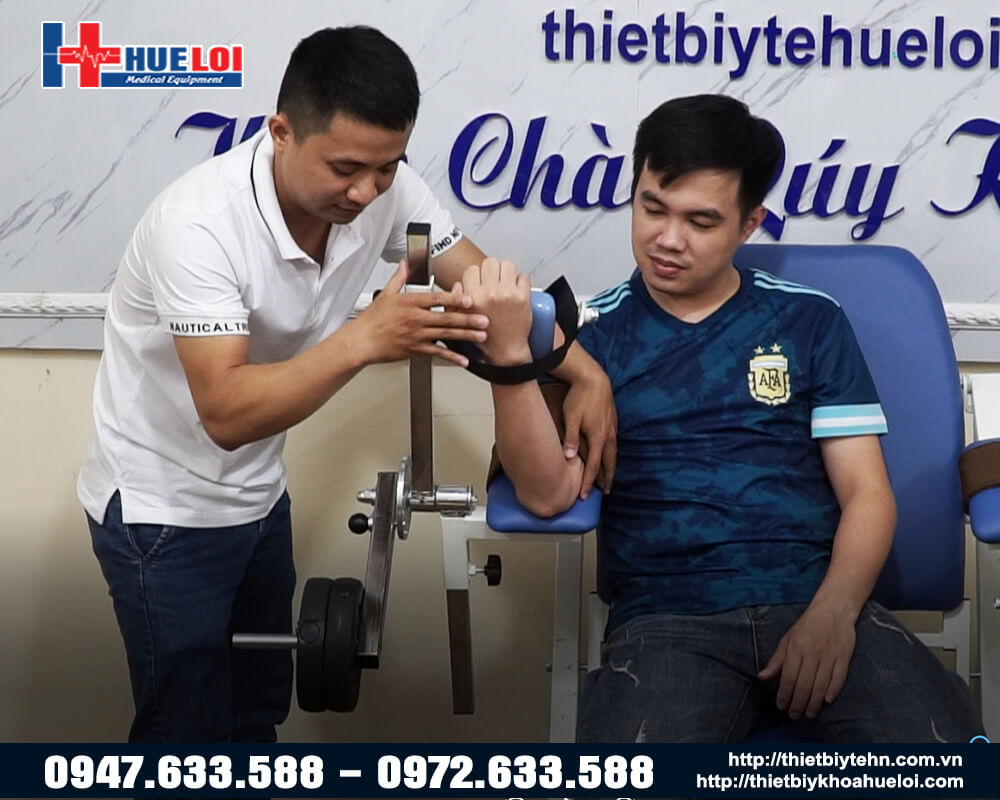 - Cách sử dụng thiết bị để tập luyện vô cùng đơn giản. Đầu tiên cho bệnh nhân ngồi vào ghế rồi tùy chỉnh các thông số như: chiều cao ghế ngồi, góc tựa lưng, chiều dài cẳng tay, góc tập, trở lực tập luyện (thông qua hệ thống bánh tạ). Sau đó cố định phần cánh tay và bàn tay thông qua các đai đai giữ.