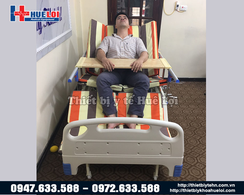 - Giường có thể dựng thẳng thành ghế ngồi với nhiều mức nâng tựa khác nhau, biến giường thành bàn ăn, hoặc giúp bệnh nhân tựa lưng đọc sách ở nhiều vị trí thoải mái.