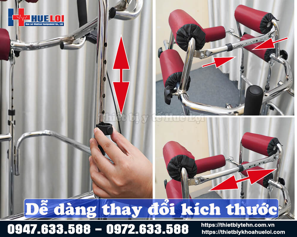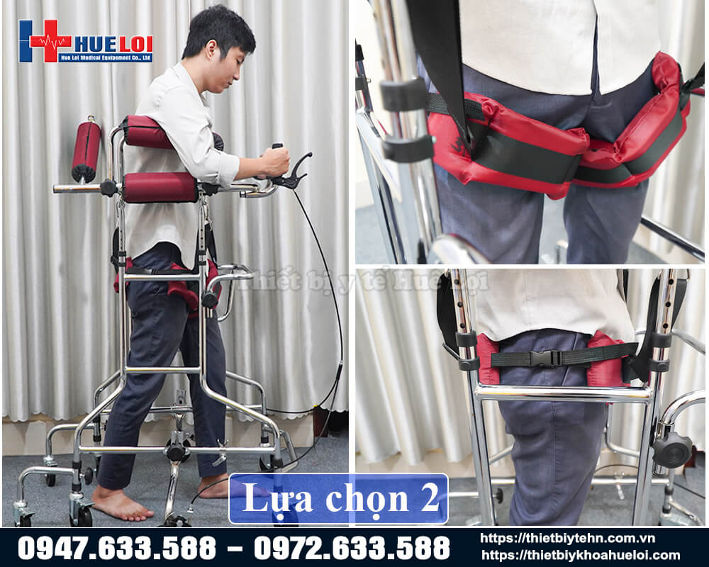 - Khung giúp người bệnh đứng thẳng bằng hệ thống đai đỡ, không cần người nhà đỡ