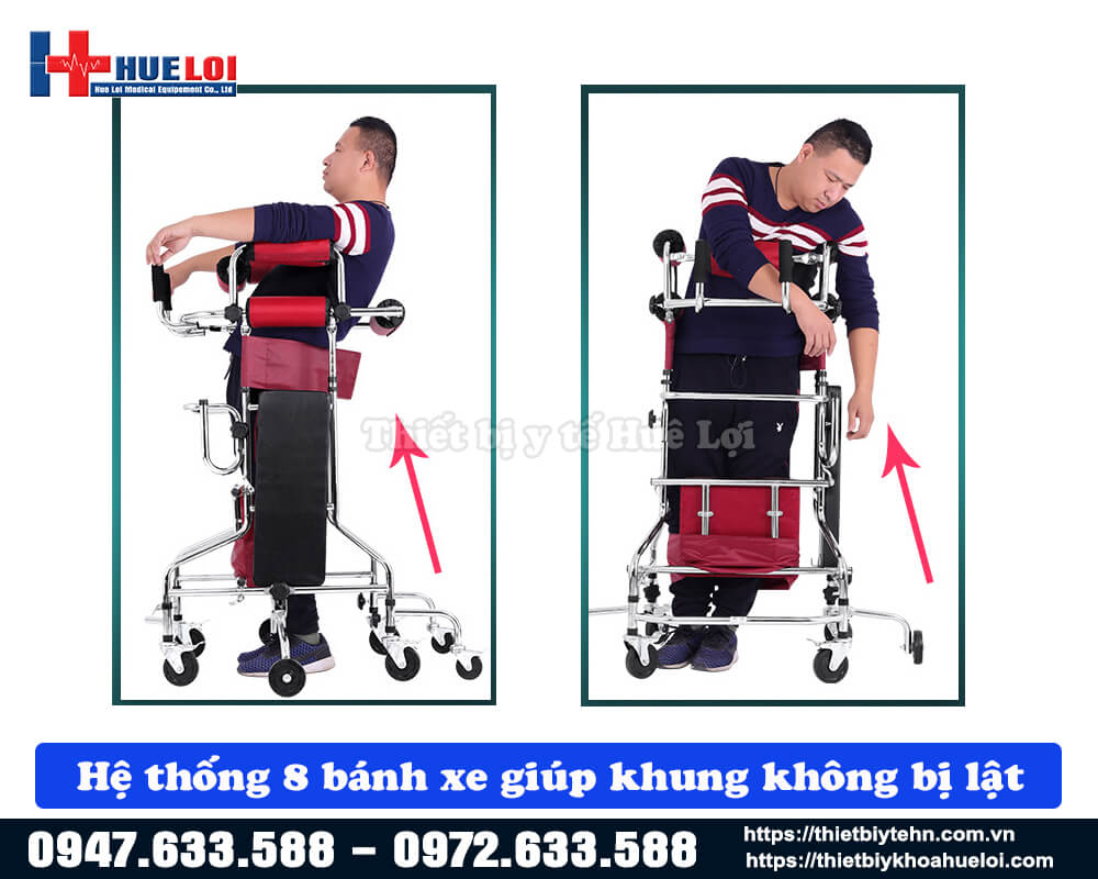 - Hệ thống 8 bánh xe có khóa hãm, khi khóa lại có thể giúp cố định khung vững chắc, bánh xe được thiết kế xoay 360 °, có khả năng di chuyển linh hoạt, dễ dàng. Hệ thống 8 bánh xe này giúp xe chống nghiêng, chống lật, đảm bảo an toàn khi bệnh nhân tập đứng và tập đi.