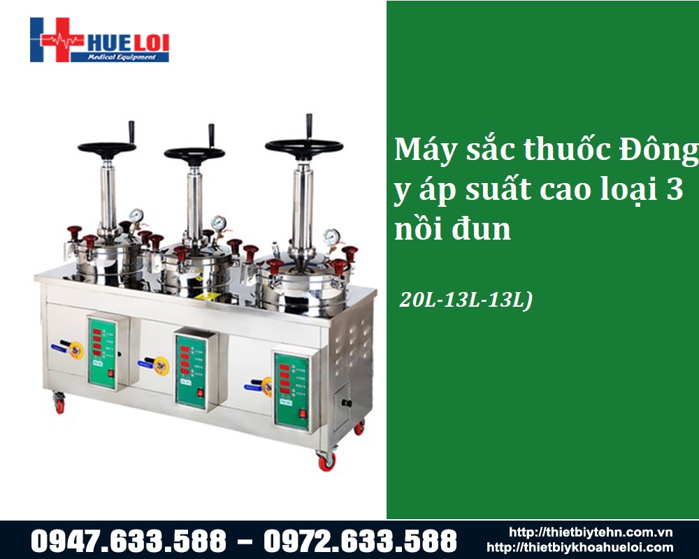 Máy sắc thuốc bắc áp suất cao loại 3 nồi đun giúp thời gian sắc thuốc trở nên nhanh chóng, đồng thời với chức năng chiết ép thuốc tự động dưới áp lực cao giúp lấy hết được tinh chất của thang thuốc, không để lãng phí dù chỉ là một giọt dược liệu. Nay được nâng cấp lên thành 3 nồi sắc thuốc khiến cho năng suất được tăng lên gấp ba. Sản phẩm thích hợp sử dụng trong các bệnh viện hoặc phòng khám Y học cổ truyền.