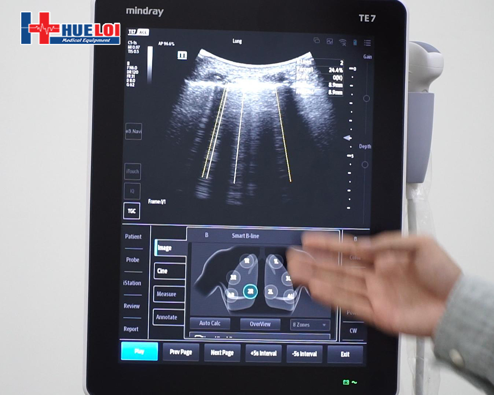 - Smart B-line tự động tính toán số đường B-line, phần trăm và khoảng cách. Nó cung cấp một sơ đồ chấm điểm trực quan để đánh giá dịch phổi, hướng dẫn truyền dịch và phòng ngừa phù phổi.