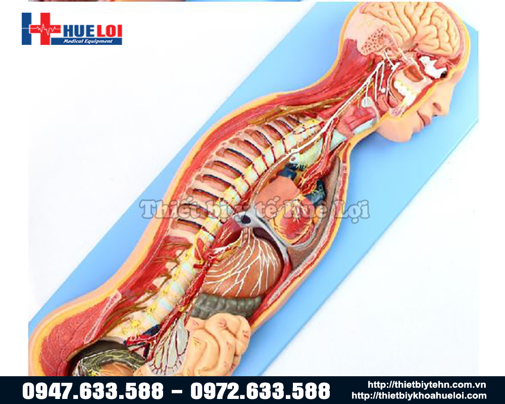 Mô hình giải phẫu hệ thần kinh trên cơ thể người cho thấy toàn bộ cấu trúc của hệ thống thần kinh tự chủ. Hệ thống thần kinh tự chủ bao gồm các dây thần kinh giao cảm và dây thần kinh phó giao cảm. Các dây thần kinh giao cảm có màu vàng trong mô hình và các dây thần kinh phó giao cảm có màu trắng.