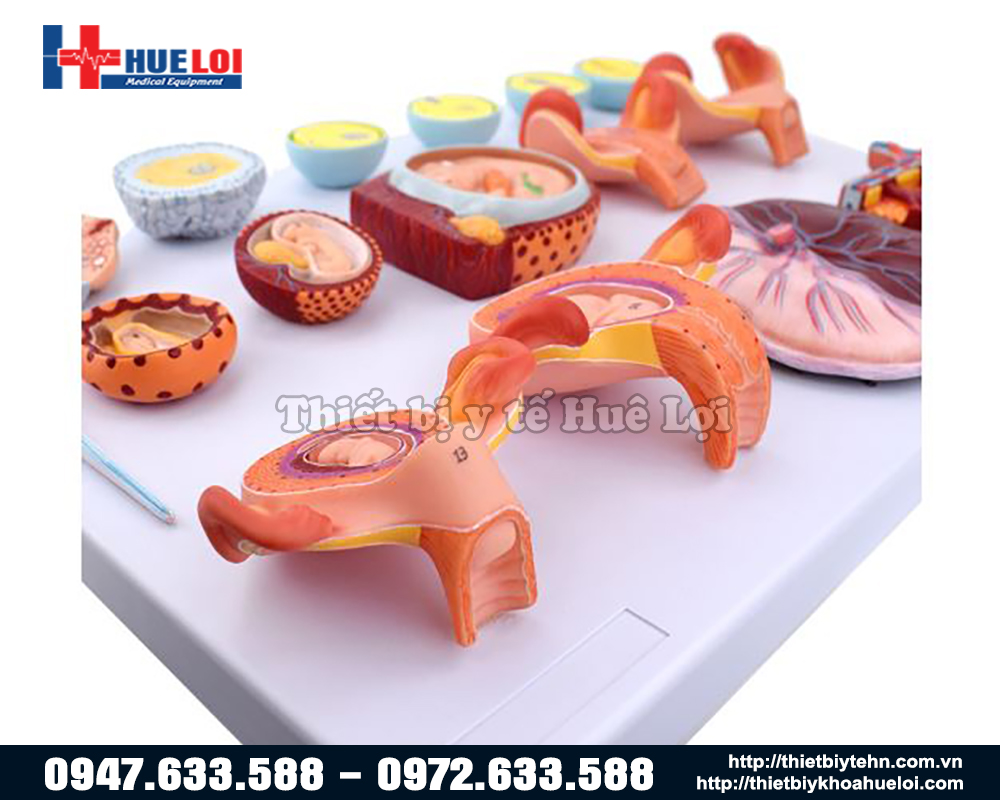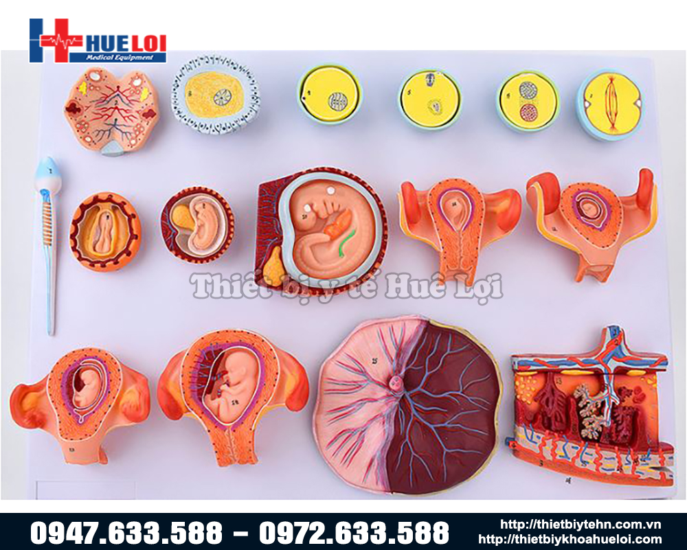 - Mô hình bao gồm 16 thành phần bao gồm tinh trùng, buồng trứng, trứng, sự phát triển của trứng được thụ tinh, phôi nang, phôi thai 2-9 tuần, thai nhi và nhau thai vào tháng 3, và cho thấy phôi thai của con người từ sự phát triển của tế bào trứng đến sự hình thành của thai nhi 3 tháng tuổi.