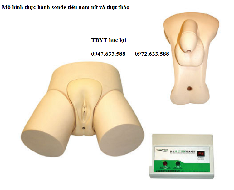 - Đặt thông tiểu nam: Dương vật có thể nâng lên giống như thực tế để sonde dễ dàng đi vào phần niệu đạo sau. Có đèn báo hiệu các giai đoạn đặt: khi sonde đi qua niệu đạo màng đèn báo màu đỏ sẽ sáng lên, khi sonde đến bàng quang đèn màu xanh sẽ sáng lên và có bơm mô phỏng nước tiểu chảy ra (khoảng 200ml, nước tiểu giả có thể bơm vào trước khi thực hành qua nắp phía trên của mô hình).
