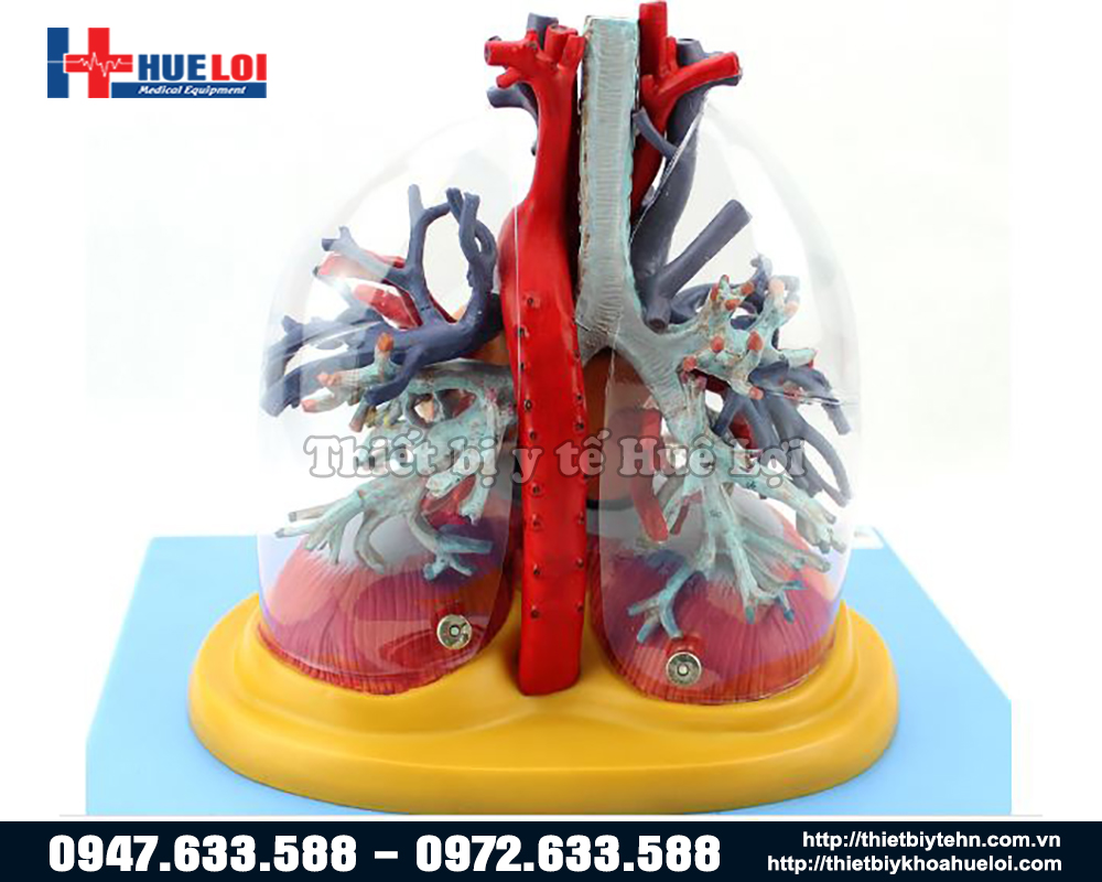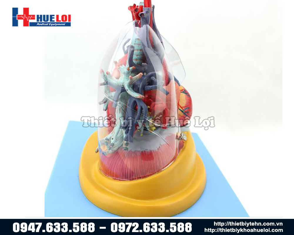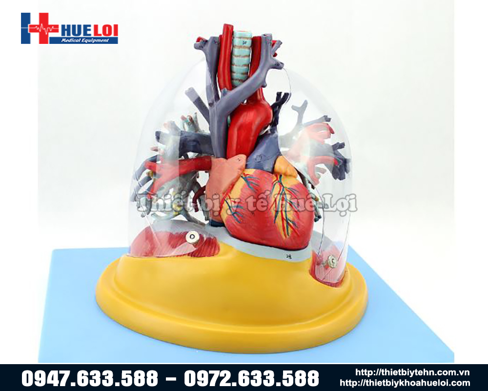 Mô hình mạch máu chi tiết của tim phổi cho thấy: hình ảnh tim, phổi, khí quản, phế quản, các nhánh phế quản và các động mạch và tĩnh mạch lớn của tim và phổi.