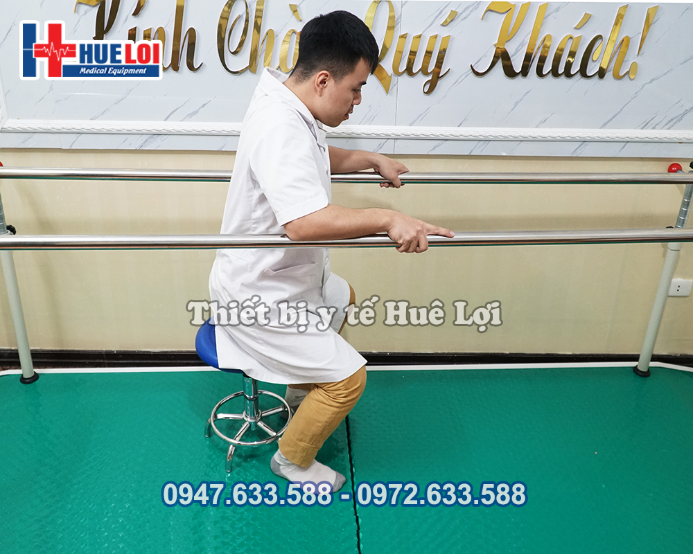 - Khoảng cách giữa 2 thanh song song đủ rộng và cũng có thể điều chỉnh để đặt vừa xe lăn. Điều này trợ giúp cho việc bệnh nhân tập đứng hoặc quá trình tập đi nếu mệt có thể ngồi nghỉ.