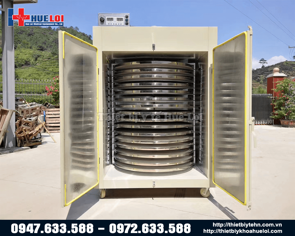 Hoặc chiếc máy hiện tại quý khách đang tham khảo, năng suất vượt quá so với nhu cầu sử dụng của quý khách, quý khách nên tham khảo tủ sấy dược liệu 08 tầng. Với công suất 1500W giúp sấy khô các loại cây thuốc, dược liệu, viên hoàn,… sấy ở nhiệt độ và thời gian tùy chỉnh theo nguyên liệu nên giữ được tối đa hoạt chất trong dược liệu và đảm bảo vệ sinh an toàn thực phẩm, thích hợp sử dụng trong các khoa bào chế đông dược của các bệnh viện hoặc phòng khám Y học cổ truyền.