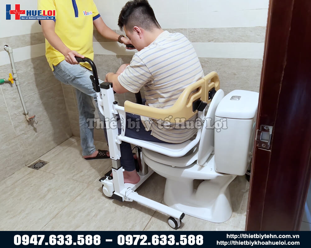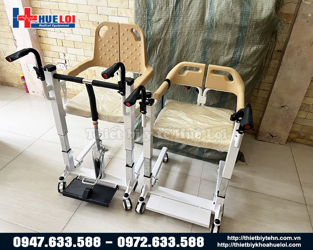 Xe lăn hai cánh nâng hạ bệnh nhân có thể tách rời thành 2, sử dụng piston để nâng hạ bệnh nhân, từ đó giúp bệnh nhân dễ dàng ngồi lên mà không cần bê/vác, chất liệu thép cực dày, nhựa ABS chống nước, có bô vệ sinh, đệm ngồi. Sản phẩm thích hợp cho những bệnh nhân gặp khó khăn trong việc đi lại, giúp người nhà giảm bớt gánh nặng trong việc chăm sóc.